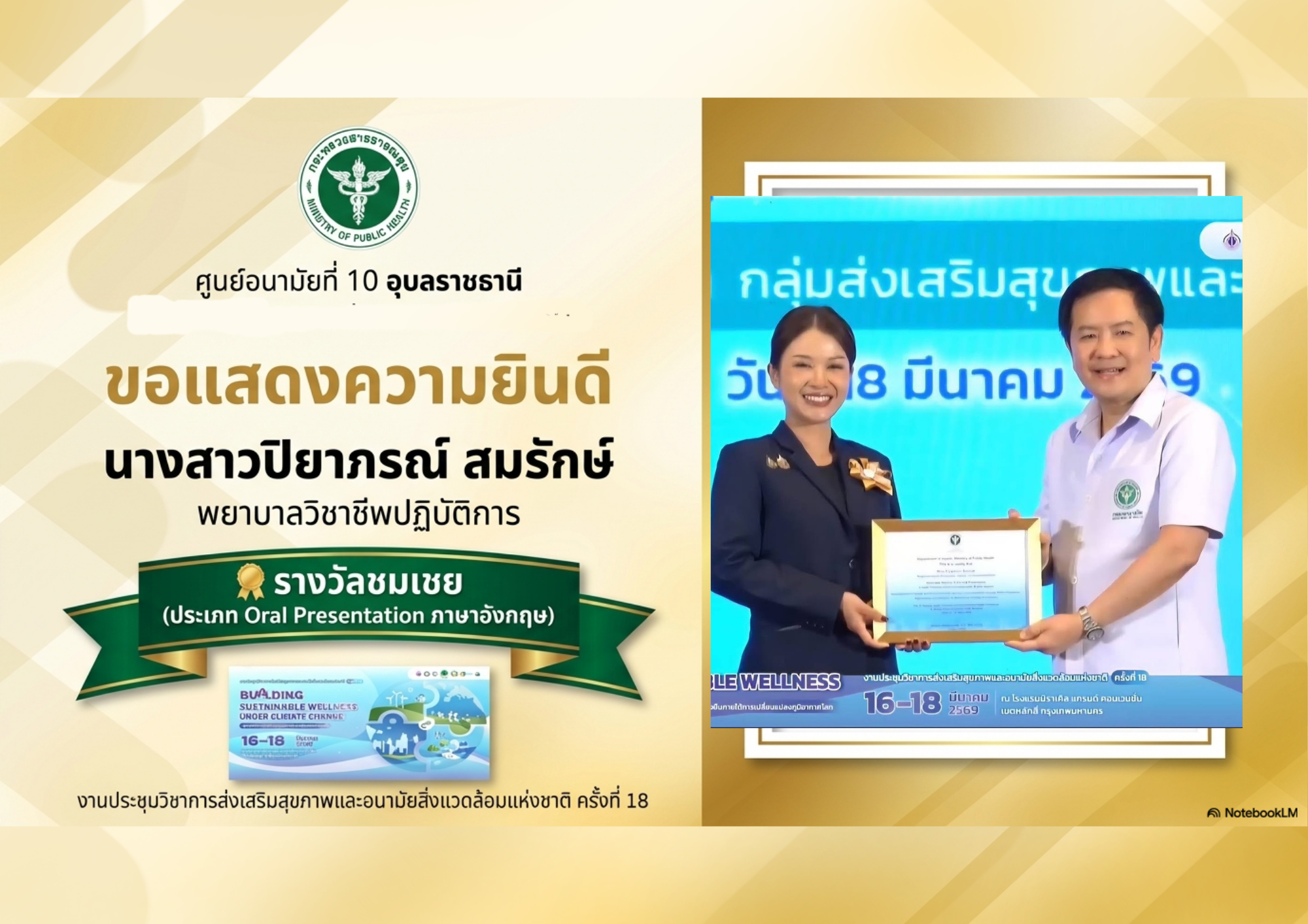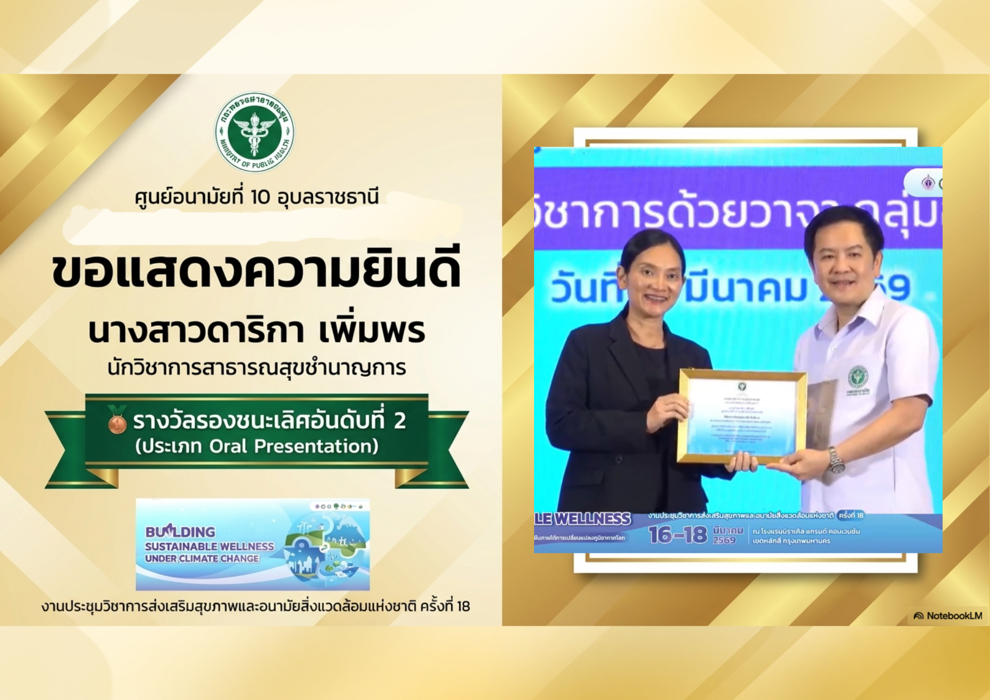 3 นางสาวดาริกา เพิ่มพร นักวิชาการสาธารณสุขชำนาญการ ได้รับรางวัลรองชนะเลิศอันดับที่ 2 (ประเภท Oral Presentation)