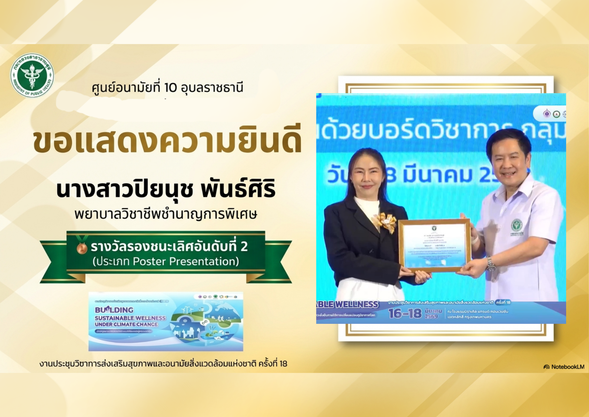 2 นางสาวปิยนุช พันธ์ศิริ พยาบาลวิชาชีพชำนาญการพิเศษ ได้รับรางวัลรองชนะเลิศอันดับที่ 2 (ประเภท Poster Presentation)