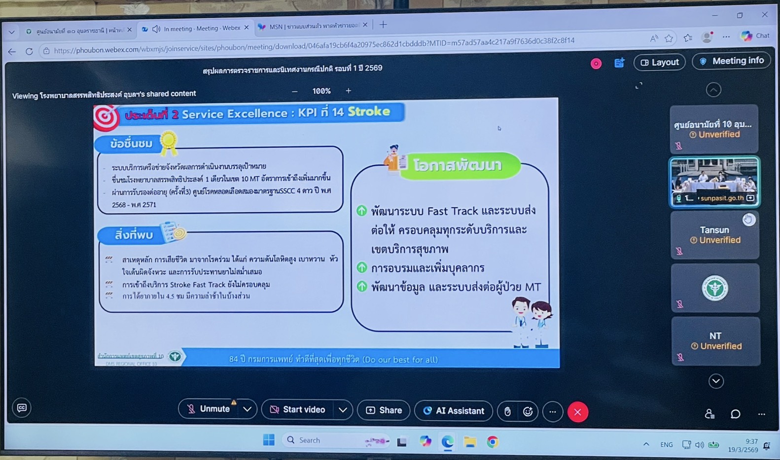 วันนี้ (19 มีนาคม 2569) นายแพทย์สุทัศน์ ไชยยศ ผู้อำนวยการศูนย์อนามัยที่ 10 อุบลราชธานี และทีมตรวจราชการ ศูนย์อนามัยที่ 10 อุบลราชธานี ร่วมประชุมสรุปผลการตรวจราชการและนิเทศงานกรณีปกติ รอบที่ 1 ประจำปีงบประมาณ พ.ศ. 2569 เขตสุขภาพที่ 10 จังหวัดอุบลราชธานี ณ ห้องประชุมโรงพยาบาลสรรพสิทธิประสงค์ พร้อมรับฟังการนำเสนอผ่านระบบออนไลน์ โดยมี นายแพทย์ธิติ แสวงธรรม ผู้ตรวจราชการกระทรวงสาธารณสุข เขตสุขภาพที่ 10 เป็นประธานฯ
